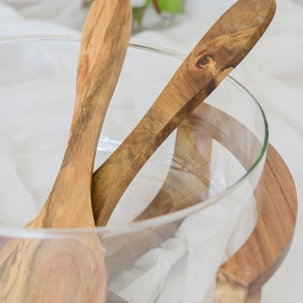 Una ensaladera de vidrio borosilicato con base y cubiertos en acacia, diseñada para servir con estilo sin complicaciones. Perfecta para quienes valoran funcionalidad y onda, tan práctica como esa amiga que siempre suma buena vibra en la mesa.